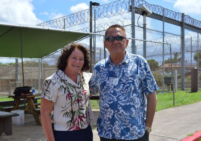 Marsha Barth and Carol Haupa (Chaplain) at the Maui Correctional Center in Maui, HI.