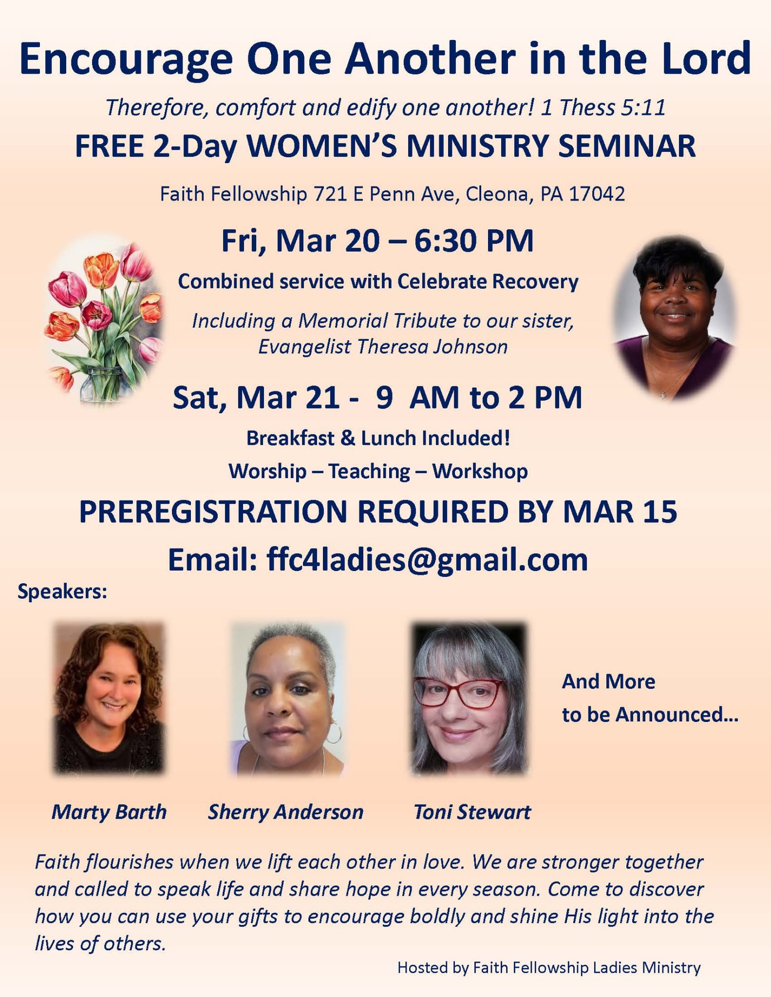 We will be having our Spring Conference at Faith Fellowship Church, on Friday March 20 and Saturday March 21. Please see the attached flier for details. In is in great memory to our dear friend, speaker and minister, Theresa Johnson, that we go forward with our theme being “Encouraging One Another in the Lord”. This is a free conference and all are welcome. Please respond so that we may have a count for providing the breakfast and lunch. Looking forward to seeing everyone there….Guest Speakers are Toni Stewart, Sherry Anderson and Marsha (Marty) Barth. Marty will also be having a book signing presenting her books, “The Shattering”, “The Shattering II”, “Tony the Lonely Dandelion”, “Amazing Grace-Heaven’s Light”.